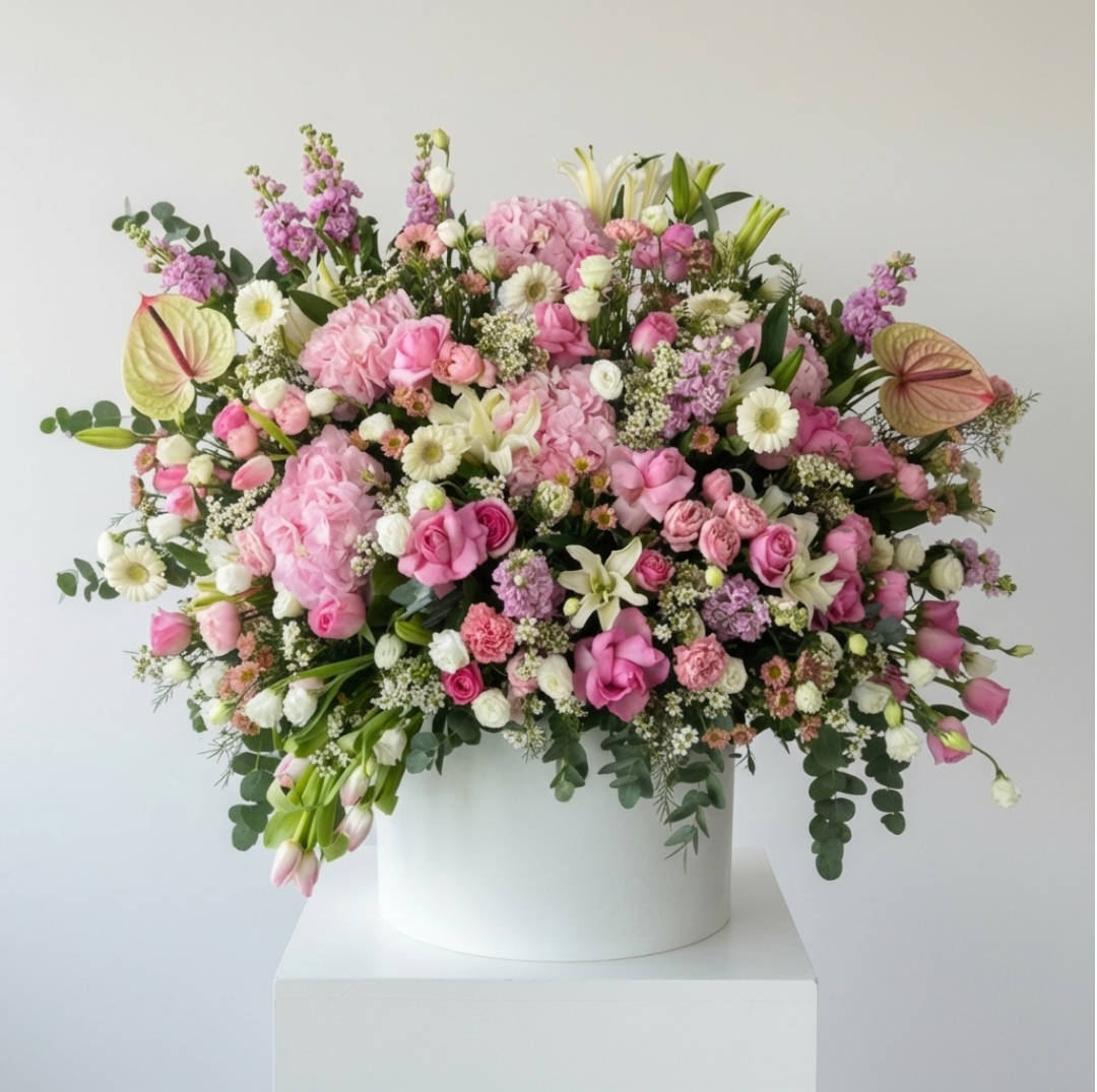 Make a grand, sophisticated statement with our Grand Pastel Elegance Floral Arrangement. This magnificent display is a symphony of soft, romantic hues, featuring an opulent mix of premium blooms like roses, lilies, hydrangeas, and anthuriums in shades of blush pink, cream, and white. Housed in a sleek white cylindrical container, it embodies grace, compassion, and timeless luxury.